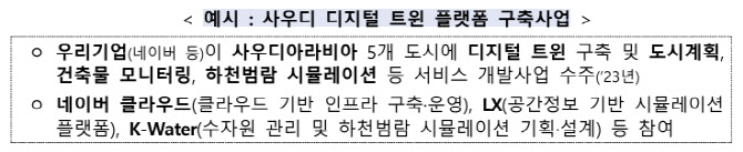 KIND 자본금 확대·해외 건설 수주 역할 강화[이데일리 최정희 기자] 2023년 네이버 등이 사우디아라비아 등 5개 도시에 디지털 트윈을 구축하고 하천범람 시뮬레이션 등의 서비스 개발 사업을 수주했다.네이버 클라우드뿐 아니라 한국국토정보공사(LX),한국수자원공사(K-water) 등이 참여한 민관 합동 K-건설 수출의 대표 사례다.