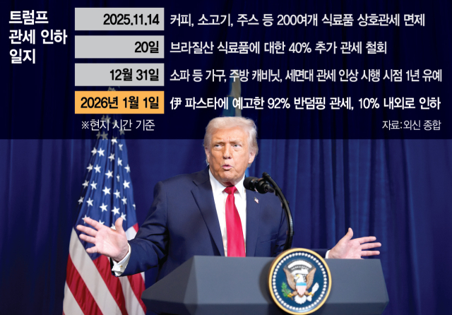 ‘관세=물가 상승’이라는 지적에도 둘의 상관관계를 부인해온 도널드 트럼프 미국 행정부가 최근 잇따라 관세를 인하하고 있다.새해 전날인 지난해 12월 31일 가구 등에 대한 관세 시행 시점을 슬그머니 1년 연기하는가 하면 이탈리아산 파스타에 대한 관세도 대폭 인하했다.11월 중간선거를 앞두고 물가를 낮추기 위한 조치로 관세가 물가를 올린다는 점을 사실상 인정한 행보라는 지적이 나온다.