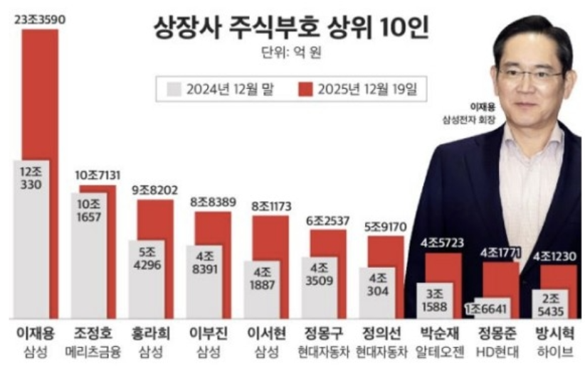 상장사 주식부호 10위권에 신진 주식부호(창업 1세대)인 박순재 알테오젠 대표(4조5천723억원)와 방시혁 하이브 의장(4조1천230억원)은 각각 8위와 10위에 올랐다.