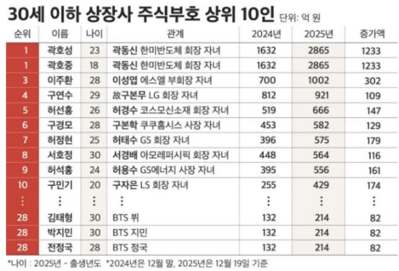또 세계적으로 인기가 높은 K-팝 그룹 방탄소년단(BTS) 멤버인 지민과 뷔,슬롯 검증사이트 xl정국이 30세 이하 상장사 주식부호 상위 100인 순위에 들어 눈길을 끌었다.