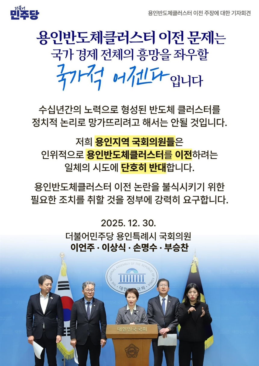지난 12월 30일,더불어민주당 경기 용인 지역 국회의원 네 명(이언주,이상식,손명수,부승찬)이 국회 소통관에서 기자회견을 열고 '용인 반도체 클러스터 이전 주장에 대한 입장문'을 발표했습니다.요지는 용인 반도체 클러스터의 지방 이전 논의를 즉각 중단하라는 것입니다.