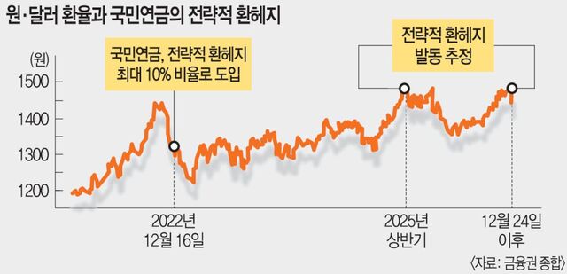 ‘전략적 환헤지’란 환율이 비정상적으로 높아졌을 때 국민연금이 보유한 해외 자산의 최대 10%를 미리 약속된 환율로 선물환 매도하는 것이다.이 경우 시중에 달러 공급이 늘어나는 효과가 발생한다.당국 입장에선 달러 공급으로 환율을 진정시키는 효과가 있고,국민연금 입장에서도 환율이‘고점’을 찍었을 때 일정 수준으로 환율을 고정해 향후 하락 리스크를 완화하는 장점이 있다.과거‘상시적 환헤지’를 시행했다가 중단한 국민연금은 2022년 레고랜드 사태의 여파로 환율이 1400원대에 진입하자 그해 12월부터 전략적 환헤지 제도를 도입해 1년씩 연장해 왔다.