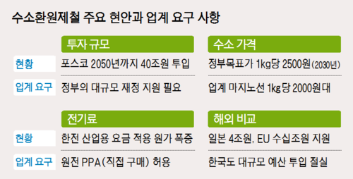 전기료 부담은 더 큰 뇌관이다.수소환원제철은 고로가 아닌 전기로를 사용해 전력 소모량이 폭증한다.업계 관계자는 “고체 상태의 환원철(DRI)을 녹이려면 막대한 전력이 필요한데 전력 소모량이 기존 고로 대비 60% 이상 증가하는 데다 부생가스 자가 발전도 불가능해져 외부 전력에 100% 의존해야 한다”며 “전기료 자체가 곧 원가 경쟁력 상실로 이어진다”고 지적했다.