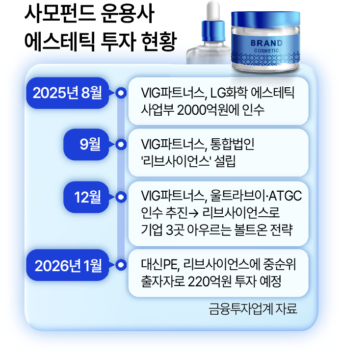 [헤럴드경제=안효정 기자] 세계적으로 K-뷰티의 인기가 높아지면서 국내 화장품 관련 인수·합병(M&A)이 활발히 이루어지고 있는 가운데,사모펀드(PEF) 운용사 VIG파트너스와 대신프라이빗에쿼티(PE)가 손을 잡고 추진하는‘섹터 통합형 투자’방식이 시장의 이목을 집중시키고 있다.