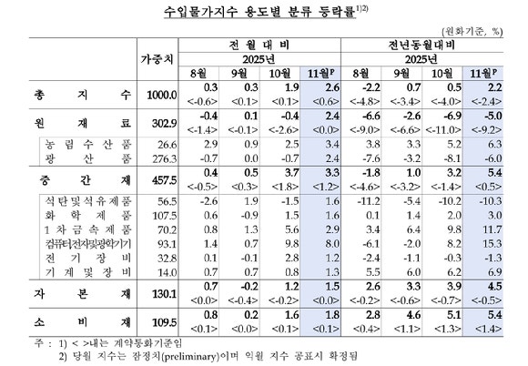 12일 한국은행의 '11월 수출입물가지수 및 무역지수(잠정)'에 따르면 수입 물가는 전월 대비 2.6% 상승했다.2024년 4월(3.8%) 이후 가장 큰 상승 폭이다.전년 동월 대비로는 2.2% 올랐다.
