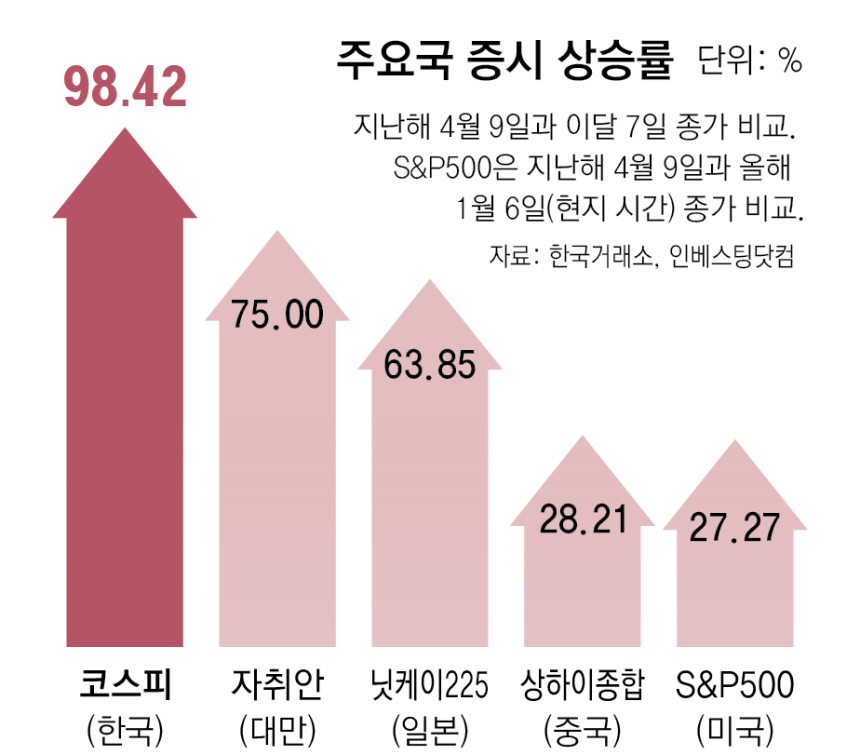 글로벌 증시가 강세를 이어가는 가운데 한국 증시는‘코리아 디스카운트’해소 기대감이 맞물려 더 큰 폭의 상승세를 보였다.지난해 4월 트럼프 대통령이 상호관세 방침을 밝힌 여파로 글로벌 증시가 급락했던 지난해 4월 9일 코스피 종가는 2,293.7까지 하락했다.9개월 만에 2,257.36포인트(98.4%)나 상승하며 두 배로 올랐다.상장기업 시가총액도 같은 기간 1880조 원에서 2배인 3759조 원으로 불어났다.이 기간 코스피의 상승 폭은 같은 기간 일본 닛케이225 평균주가(67%),대만 자취안지수(75%)보다 두드러진다.