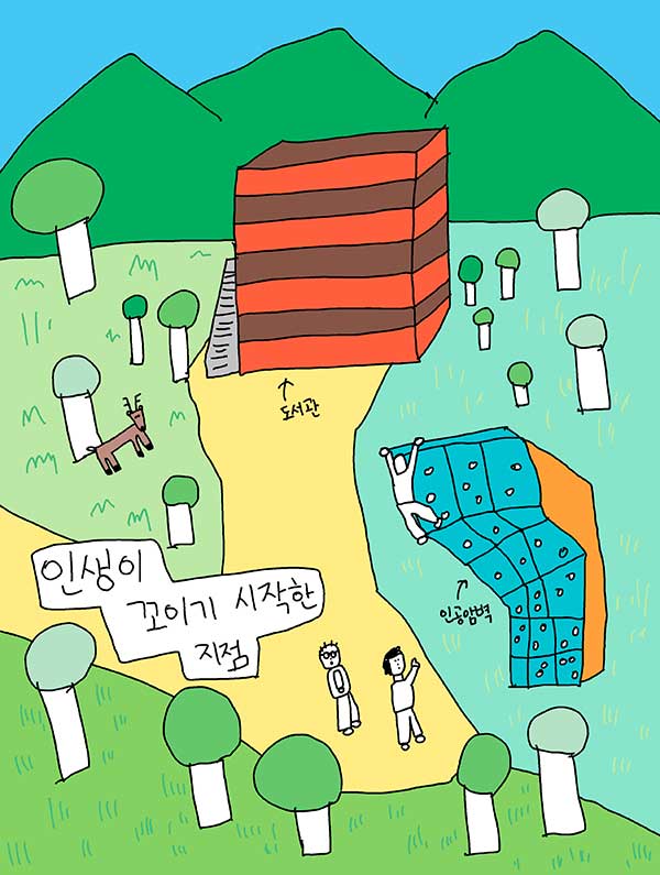 학교 도서관은 높은 곳에 있었다.가는 길이 매우 가파르고 좁았다.방과 후 야간 자율학습은 도서관에서 진행됐다.그러니까 고3 전원은 모두 그 오르막을 매일 꼭 한 번 이상 올랐다.친구들은 '야자'보다 도서관 가는 길을 더 싫어했다.300명이 넘는 고3 전체 인원 중 딱 3명만 달랐다.3명은 도서관 옆에 솟아 있던 얇은 철판으로 이뤄진 '벽'의 존재를 알았다.도서관으로 가다가 잠깐 옆길로 빠져 철판 앞에서 서성이는 사람은 이들 3명뿐이었다.3명은 철판을 인공암벽이라고 불렀다.인공암벽의 높이는 3m 정도였고,매우 낡아 있었다.벽이 무너질까봐 누구도 쉽게 근처에 가지 않았는데,3명은 이따금 철판에 박힌 바위 모양을 본 뜬 손잡이를 붙잡고 꼭대기까지 올라갔다가 내려가곤 했다.그 3명은 학교에서 아무도 존재를 모르는 산악부 회원이었고,그중 하나가 나였다.