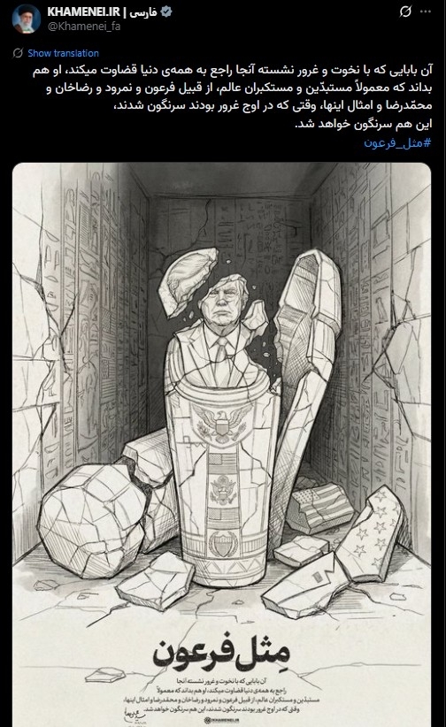 미국 CNN방송에 따르면 이란 최고지도자 아야톨라 세예드 알리 하메네이의 공식 엑스(X) 계정은 12일(현지시간) 새벽 트럼프 대통령을 무너지는 석관으로 그린 삽화를 올렸다.