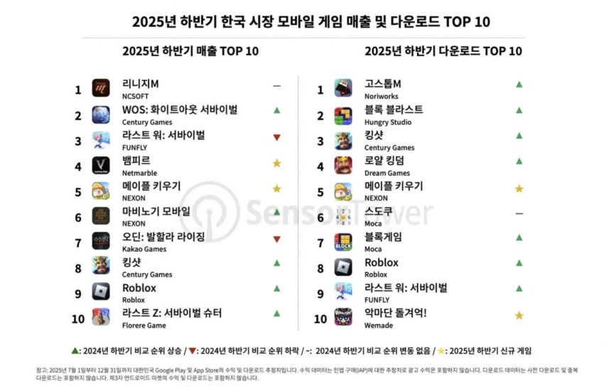 이번 하반기 성장의 가장 큰 특징은 장기 흥행작의 건재함과 신작 RPG의 약진이다.특히‘리니지M’은 8주년 이벤트 성과에 힘입어 매출 1위 자리를 굳게 지켰으며,중국산 게임‘화이트아웃 서바이벌’은 역대 최고 월 매출을 경신하며 2위에 올랐다.