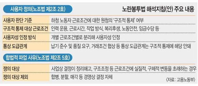 기업의 해외투자,합병 같은 경영상 결정이 정리해고 등으로 이어지면 노동자들의 합법적 파업 사유가 될 수 있다는 정부의 법 해석이 나왔다.정부는 하청 노동자와 교섭할 의무가 있는 원청 사용자를 판단하는 기준으로‘구조적 통제’를 제시했다.