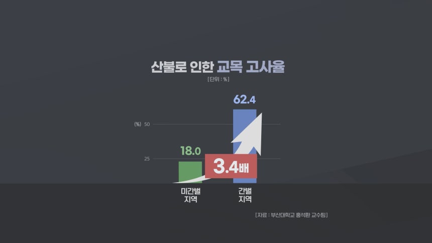 숲 가꾸기,다른 말로 간벌이라고 부르는데요.나무가 너무 밀집하면 햇빛이나 물,영양분을 경쟁해 성장이 더뎌지고 병충해 발생도 쉬우니 나무들이 적당한 간격을 유지해서 잘 자라도록 불필요한 나무를 솎아내는 겁니다.그런데 연구팀에 따르면,산불 피해지역 1,050개 지점을 분석한 결과 간벌한 숲에서 교목 고사율이 미 간벌 숲보다 3.4배 높았습니다.