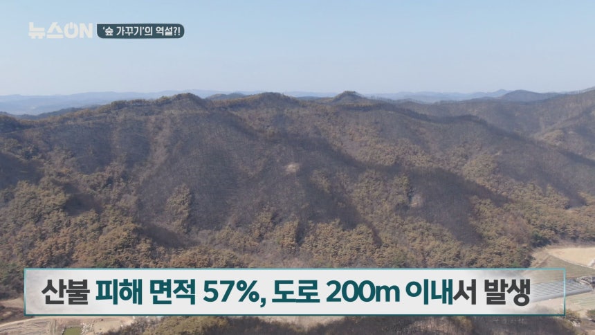 산불 예방,정확하게는 빠른 '진화'를 위해 임도 개설도 하나의 안으로 나오는데,이 부분을 좀 생각해 봐야 하는 대목도 있었습니다.연구진은 이번 산불 피해 면적이 11만 6천 300여 ha로 산림청 발표보다 만 7천여 ha 더 넓게 확인됐다고 했습니다.그리고 이 전체 산불 피해 면적의 57%가 도로에서부터 200m 이내에서 발생했고,도로에서 멀어질수록 피해 면적이 급감한 것으로 조사됐다며 '산림 관리를 위해 만든 임도나 도로'가 오히려 건조화와 바람 유입으로 인한 산불 확산 경로가 됐다고 분석했습니다.