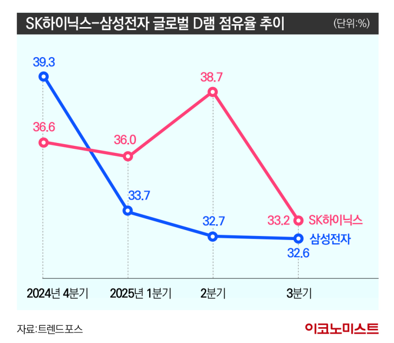이런 추세가 이어진다면 4분기에는 삼성전자가 확실하게 글로벌 D램 1위를 다시 꿰찰 것이라는 전망이다.트렌드포스 기준 SK하이닉스와 삼성전자의 점유율 격차는 순위가 뒤바뀐 올해 1분기 2.3%포인트에서 2분기 6%포인트로 확 벌어졌다.그러다 3분기에 0.6%포인트로 삼성전자가 턱밑까지 추격하는 데 성공했다.