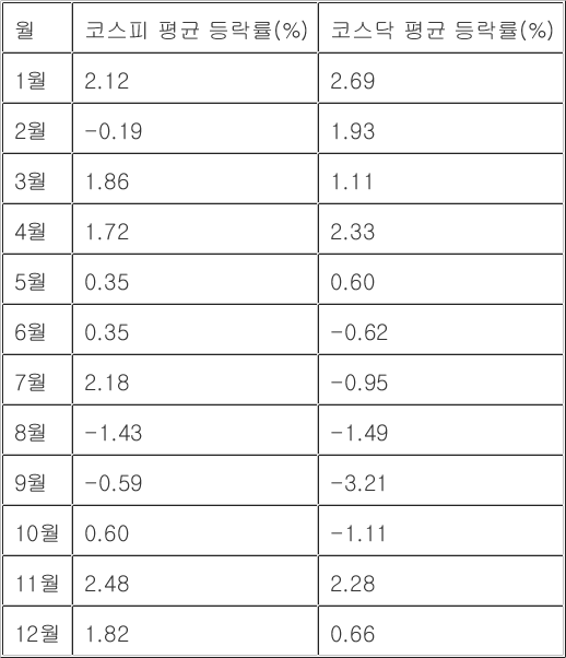 [표] 역대 코스피·코스닥 월별 평균 등락률