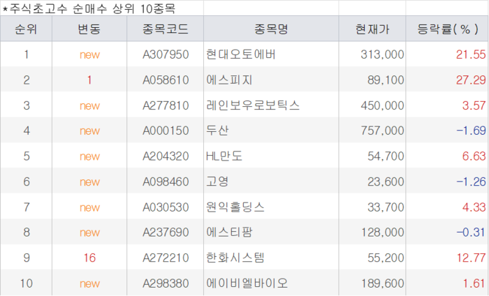 순매수 2위는 정밀 감속기 전문 기업 에스피지다.에스피지는 이날 27.29% 폭등한 8만 9100원을 기록 중이다.로봇 산업의 핵심 부품인 감속기 국산화 선두 주자로서,최근 대기업들의 로봇 사업 진출 확대와 맞물려 공급망 편입 기대감이 커진 것이 주가 급등의 원인으로 꼽힌다.초고수들은 로봇 테마의 순환매 장세 속에서 부품 대장주인 에스피지의 성장성에 베팅한 것으로 보인다.