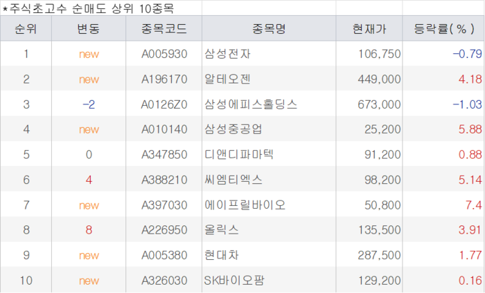 3위는 삼성에피스홀딩스다.주가는 1.03% 하락한 67만 3000원이다.바이오시밀러 시장의 경쟁 심화 우려와 밸류에이션 부담이 작용하며 초고수들의 매도 리스트에 이름을 올렸다.