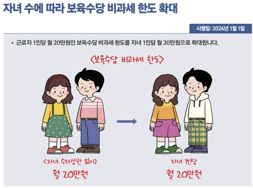 재직자 1인당 월 20만원인 보육수당 비과세 한도도 자녀 1인당 월 20만원으로 확대한다.만 9세 미만 초등학교 저학년 자녀의 예체능 학원비도 교육비 세액공제를 받을 수 있다.