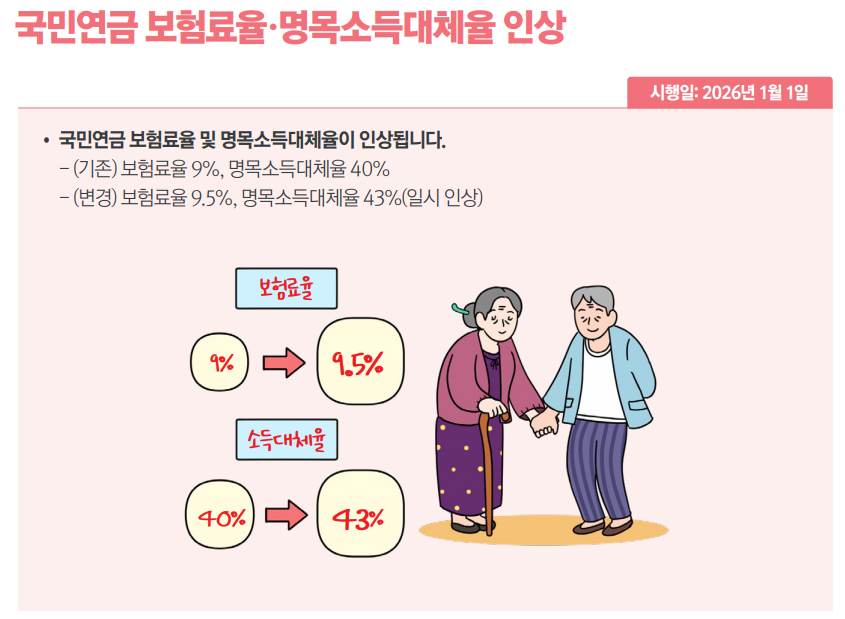 국민연금 보험료는 현행 9%에서 9.5%로 인상된다.월 소득이 309만원인 직장가입자의 연금 보험료는 올해보다 7700원 늘어난 14만6700원이 된다.소득대체율도 41.5%에서 43%로 오른다.생애 평균 월 소득이 309만원인 가입자가 40년간 보험료를 납부할 경우,월 연금액은 기존 123만7000원에서 9만2000원 늘어난 132만9000원이 된다.