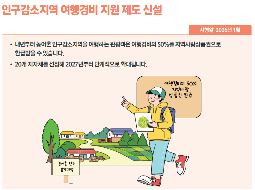 인구감소지역에 대한 여행경비 지원 제도가 신설돼 1월부터 농어촌 인구감소지역을 여행하는 관광객은 여행경비의 50%를 지역사랑상품권으로 환급받을 수 있다.환급 한도는 단체 20만원,개인 10만원이다.인구감소지역 89개 지자체 중 광역시·구를 제외한 84개 지자체 대상으로 20개 지역을 선정해 시범 사업을 실시한 뒤,2027년부터 본사업을 진행한다.