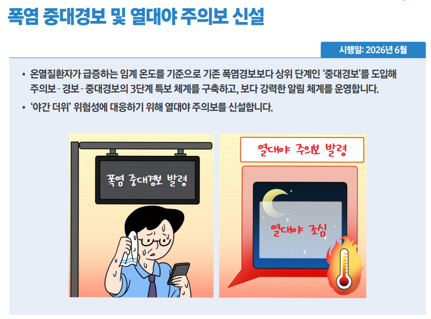 여름철 기상경보는 지금보다 세분화된다.기상청은 기존‘폭염주의보’와‘폭염경보’2단계로 운영하던 폭염특보에‘폭염 중대경보’를 추가해 내년 6월부터 3단계 체계로 개편한다.야간 폭염으로 인한 건강 피해에 대응하기 위해‘열대야 주의보’도 새로 도입한다.