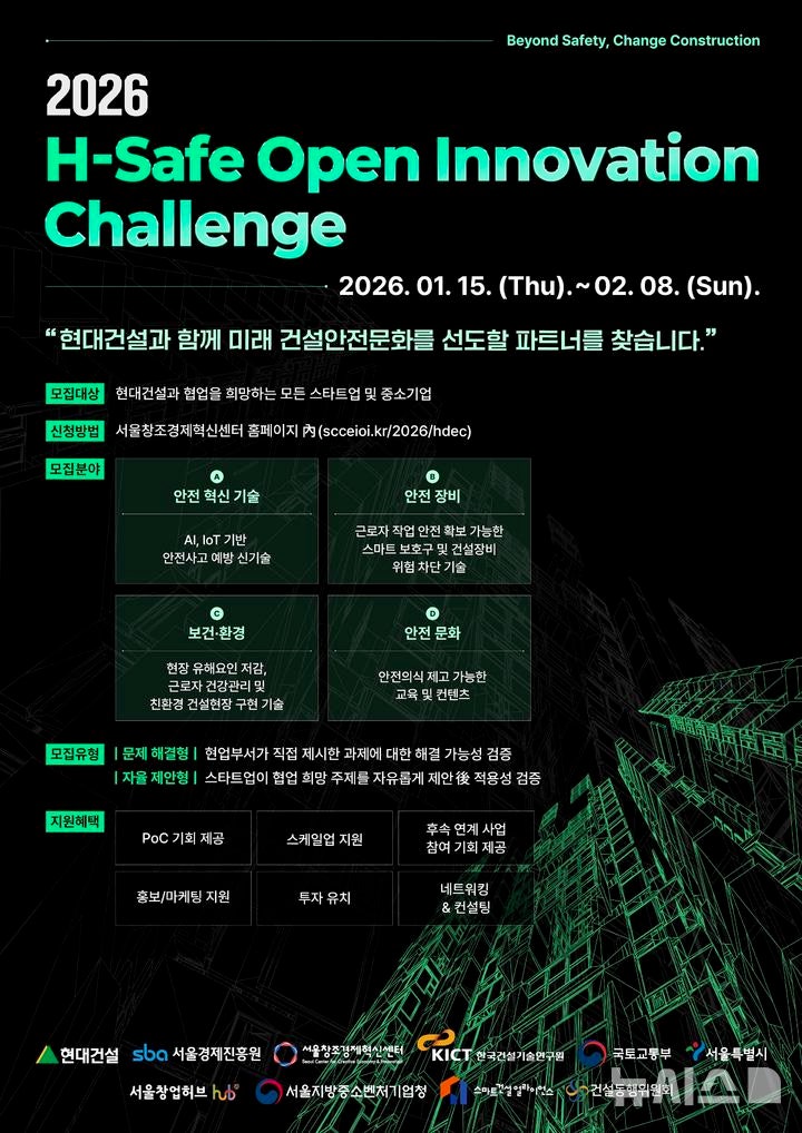 또 국내 최초로 '건설 안전'을 주제로 한 오픈이노베이션 프로그램인 '2026 H-Safe Open Innovation Challenge' 공모전을 공동 개최한다.모집 분야는 ▲안전 혁신기술 ▲안전 장비 ▲보건·환경 ▲안전 문화 등 총 4개 분야이며 접수 기간은 오는 15일부터 다음달 8일까지다.현대건설과 협업을 희망하는 중소기업·스타트업은 모두 참여할 수 있다.서류 및 대면 심사 등을 거쳐 3월 말 최종 선발한다.선발 기업은 기술 검증(PoC) 기회 및 사업화 지원금 제공,라이브스코어 어플홍보·마케팅,라이브스코어 어플투자 유치 등의 혜택을 받는다.