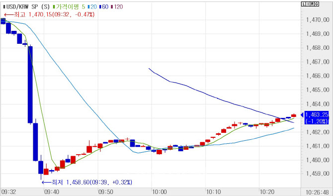 이날 서울외국환중개에 따르면 환율은 오전 9시 39분 1458원까지 떨어지면서 지난달 26일(1457원) 이후 약 한 달 만에 최저치를 기록했다.환율은 이날 1484.9원으로 전일대비 상승 출발했으나 당국 구두개입 직후 일시적으로 급락세를 보였다.오전 10시 12분 현재는 전일대비 21.9원(1.48%) 1461.9원에 거래되고 있다.