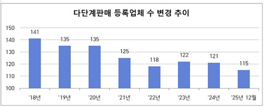 [더팩트ㅣ세종=박은평 기자] 지난해 12월 말 기준 다단계판매업 등록업체가 115개사로 나타났다.전분기 대비 1곳 줄었다.