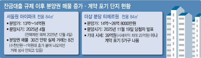 이 같은 흐름은 고가 단지에서 더욱 뚜렷하다.가장 최근 사례로 경기 성남시 분당구 정자동 더샵 분당 티에르원(느티마을 3단지 리모델링)에서는 최근 계약 포기로 무순위 청약 물량 5가구가 나왔다.이 단지는 전용 84.73㎡ 기준으로 층·동·옵션에 따라 분양가가 14억원대에서 최고 26억원대까지 형성됐다.인근 동일 면적 아파트가 최근 39억원에 거래된 점을 감안하면 최소 13억원에서 최대 25억원가량의 시세차익이 기대되는 구조다.시세차익과 함께 미래 가치 상승 기대감에 더샵 분당 티에르원은 지난달 일반공급 1순위 청약에서 47가구 모집에 4721명이 몰리며 평균 경쟁률 100.4대 1을 기록했다.그럼에도 전용 84㎡ 기준 최고 분양가가 26억 8400만원에 달하는 등 절대적인 가격 부담과 잔금 대출 규제가 겹치며 5명의 당첨자가 계약을 잇따라 포기했다는 분석이 나오고 있다.