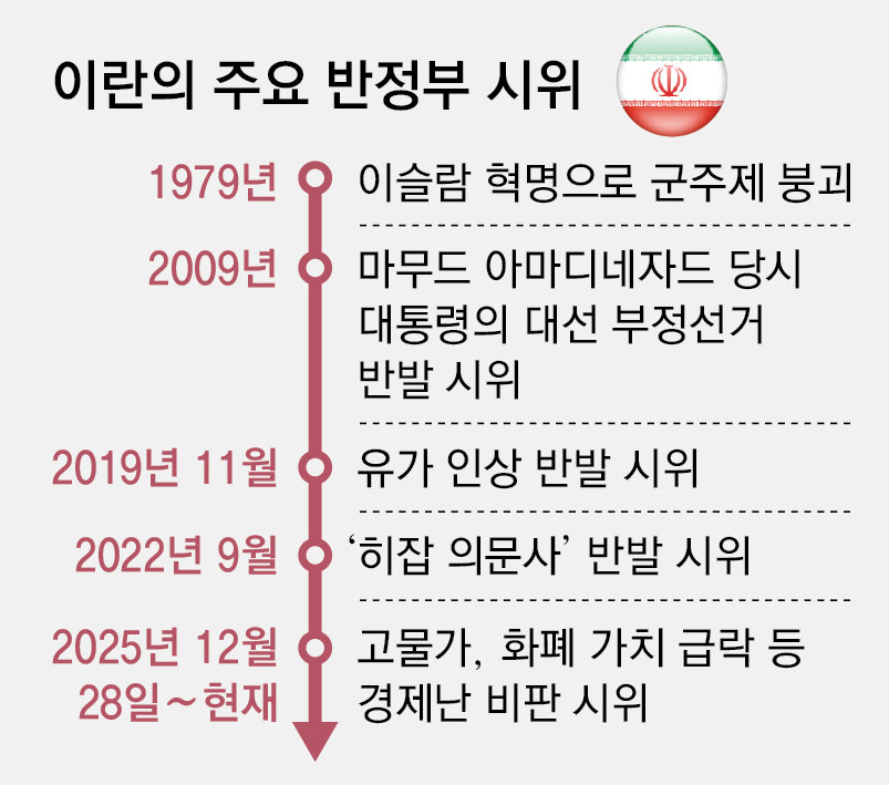 지난해 6월 이스라엘과의‘12일 전쟁’당시 핵과 미사일 관련 시설이 대거 파괴된 것도 하메네이의 정치적 입지와‘중동의 군사강국’이미지를 크게 훼손했다.이미 트럼프 대통령,베냐민 네타냐후 이스라엘 총리는 지난해 12월 29일 회동에서 “이란이 핵 시설 재건과 미사일 전력 재비축을 기도한다면 군사 행동의 대상이 될 것”이라고 경고한 상태다.