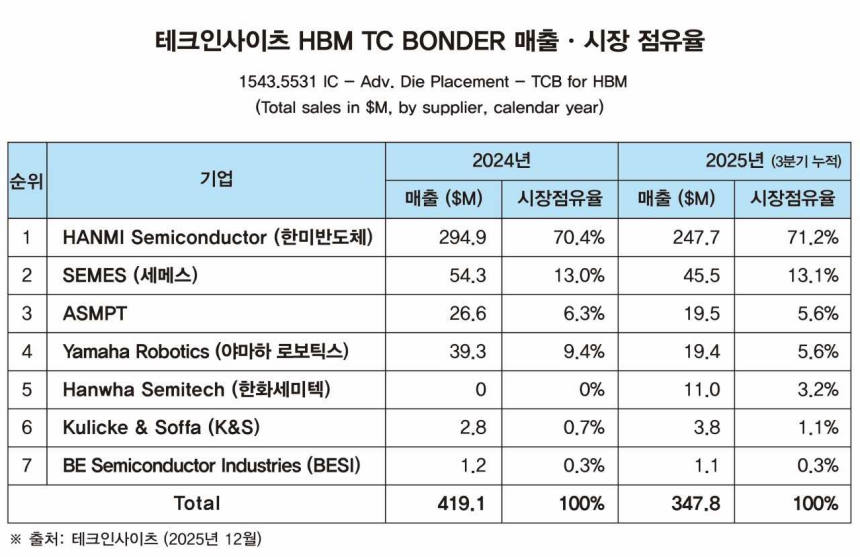 글로벌 반도체 시장조사기관 테크인사이츠가 19일(미국 현지시간) 발표한‘2025년 HBM용 TC 본더 시장 보고서’에 따르면 한미반도체는 올해 3분기 누적 매출 2억4770만달러(약 3660억원)를 기록하며 시장 점유율 71.2%로 1위를 차지했다.