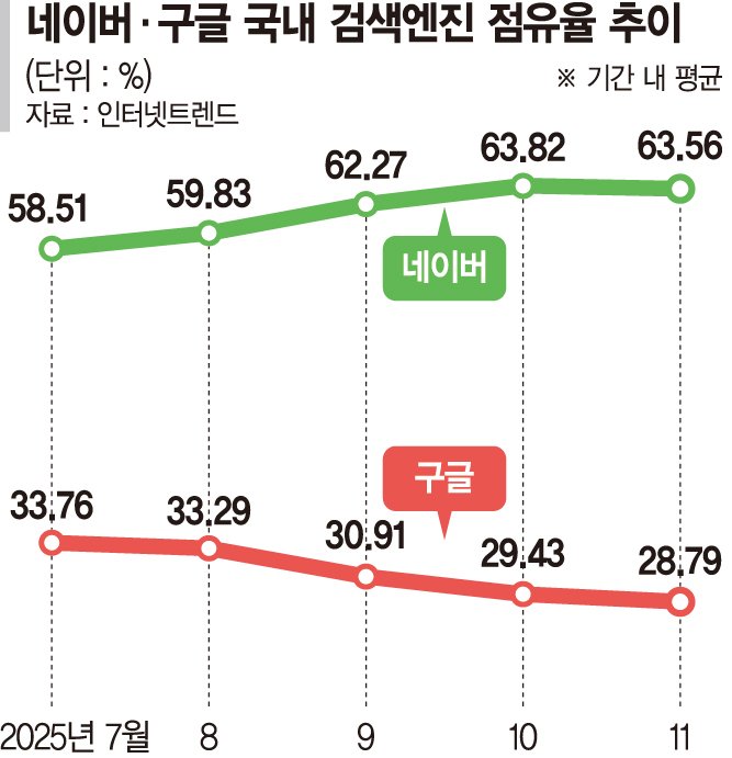 네이버는 사용자의 검색 만족도를 높이는 동시에 플랫폼 점유율을 유지하는 성과를 거두고 있다.웹로그 분석 사이트 인터넷트렌드에 따르면 네이버의 국내 검색엔진 점유율은 지난 1월부터 6월까지 60% 이상을 유지해왔으나 지난 7월 평균 점유율이 58.51%까지 떨어졌다.하지만 네이버가 AI 브리핑 기능을 고도화하면서 지난 9월 점유율 60%대를 다시 회복한 이후 현재까지 60%대 초·중반을 유지하고 있다.