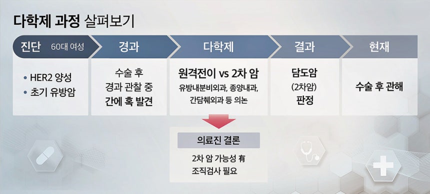 유방내분비외과,종양내과,성형외과 외에도 방사선종양학과,영상의학과,재활의학과,핵의학과,병리과 등 여러 진료과가 다학제에 참여해 논의한다.박경화 교수는 "판단이 어려운 경우에는 다학제로 다양한 전문가가 한자리에서 의논하면,혼자 결정하는 것보다 훨씬 좋은 결정을 내릴 수 있다"며 "단순히 얼마나 오래 사는가를 넘어 어떤 삶의 질로 살아가는지를 함께 고민한다"고 했다.