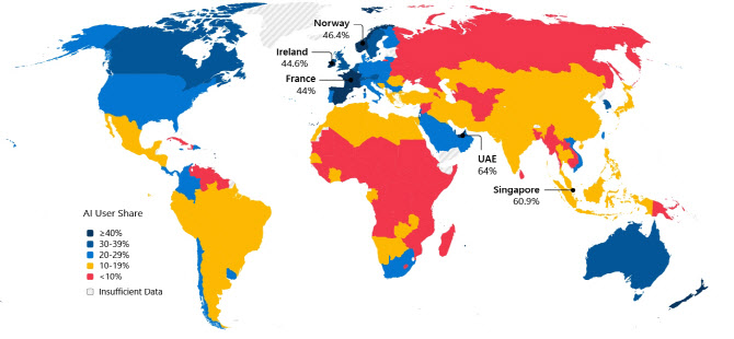 다만 지역 간 불균형은 더욱 뚜렷해졌다.글로벌 노스의 채택률(24.7%)은 글로벌 사우스(14.1%)에 비해 두 배 가까이 높았으며,두 지역 간 격차는 2025년 상반기 9.8% 포인트에서 하반기 10.6% 포인트로 확대됐다.상위권 순위에서는 아랍에미리트와 싱가포르가 1,2위를 유지한 가운데 노르웨이,아일랜드,프랑스,스페인이 그 뒤를 이으며 안정적인 지형을 형성했다.