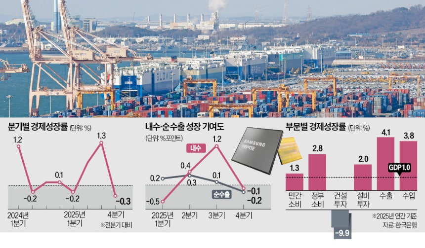 이동원 한은 경제통계2국장은 지난해 4분기 역성장한 이유에 대해 “자동차와 기계장비 등의 수출이 미국 관세 부과 여파로 둔화했고,건설투자 회복세가 기대에 미치지 못했다”며 “3분기 1.3%의 높은 성장률을 기록한 데 따른 기저효과도 있다”고 설명했다.