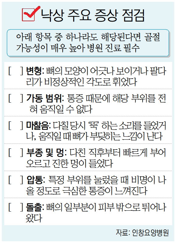 낙상 사고 때 가장 많이 다치는 부위는 손목이다.넘어질 때 손을 짚으면서 손목에 충격이 가해지기 때문이다.부기가 가라앉지 않고 손목을 움직이기 힘들 정도로 통증이 지속되면 골절 가능성을 의심해야 한다.