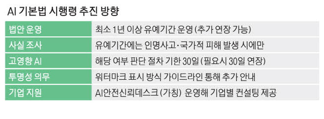 정부는 AI 기본법에 있어 최소 1년 이상 규제 유예기간을 운영하되,해외 동향이나 기술 발전 속도를 고려해 유예 연장 가능성을 열어둘 예정이다.