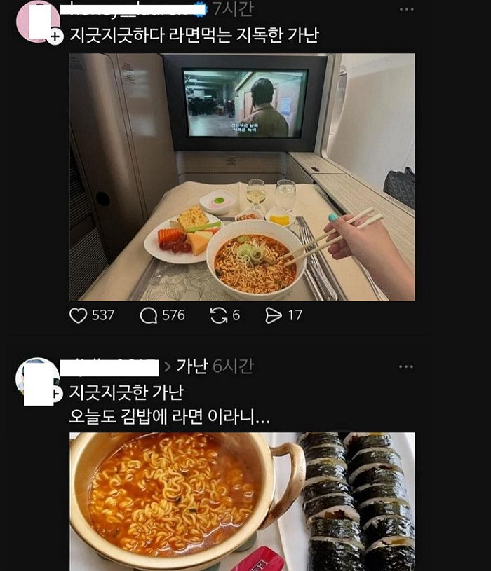 최근 사회관계망서비스(SNS)에는 비행기 1등석에서 라면을 먹으며 “이 지긋지긋한 가난”이라고 적거나,억대 수입차 열쇠와 함께 “오늘도 김밥에 라면이다”라는 글을 올린 사진들이 공유되고 있다.