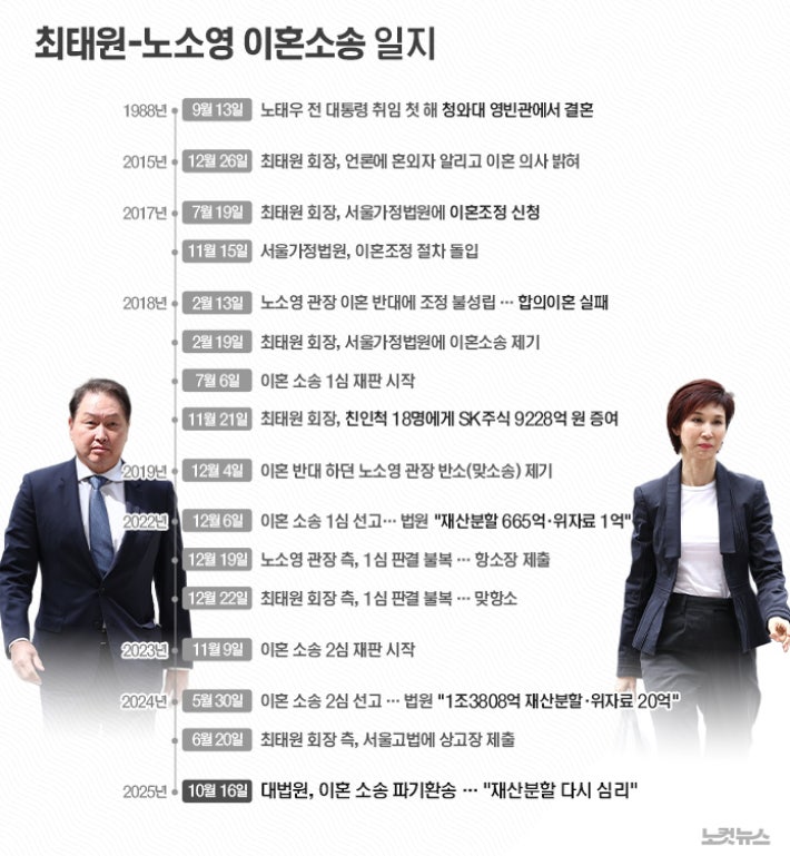 앞서 대법원 1부(주심 서경환 대법관)는 지난해 10월 16일 최 회장과 노 관장의 이혼소송 상고심에서 "최 회장이 노 관장에게 재산분할로 1조3808억 원을 지급하라"는 원심을 깨고 사건을 서울고법으로 돌려보냈다.