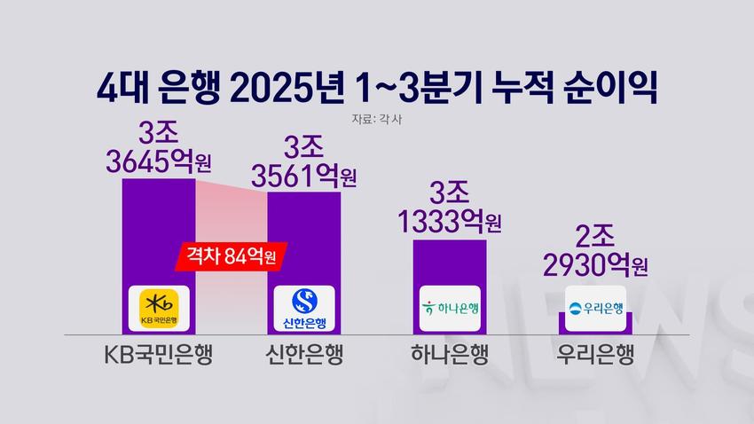 오늘 금융권에 따르면 3분기 누적 순이익 기준으로 국민은행이 4년 만에 선두에 복귀했지만,신한은행이 곧바로 뒤쫓으며 격차를 좁히고 있습니다.하나은행 역시 빠르게 선두 대열에 합류했습니다.