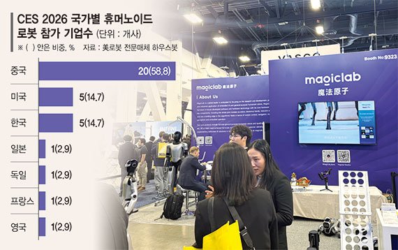 미국 로봇 전문 플랫폼·미디어 하우스봇에 따르면 CES 2026에 참가한 핵심 휴머노이드 로봇 전시 기업은 총 36곳으로,이 가운데 중국 기업이 20여 곳으로 절반을 훌쩍 넘긴 58.8%를 기록했다.미국과 한국은 각각 5곳에 그쳤고,일본·유럽 등 기타 국가는 4곳으로 집계됐다.중국 로보틱스의 영향력이 숫자로 증명되며,올해 CES 최대 화두인 '피지컬 인공지능(AI)'의 핵심인 휴머노이드,가사 로봇 등 로보틱스 분야에서 중국 기업의 존재감이 무시할 수 없이 커진 것으로 나타났다.