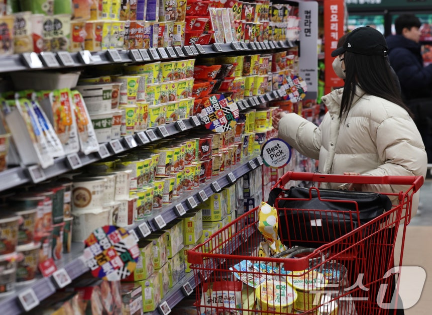 (서울=뉴스1) 구윤성 기자 = 12일 서울의 한 대형마트에서 외국인 관광객들이 라면을 구입하고 있다.