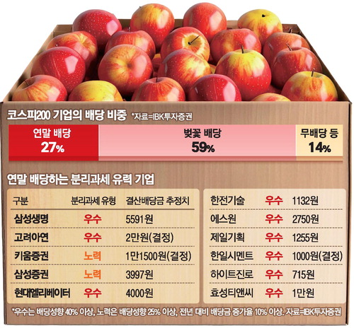 25일 IBK투자증권에 따르면 코스피 200 구성 종목 가운데 27%인 54개가 올해 말을 배당기준일로 두고 있다.배당을 하지 않았거나 지난해까지 '연말 배당'을 했던 기업 중 약 20곳이 배당 기준일을 바꾸면서 내년에는 약 118개 기업이 '벚꽃 배당'에 나선다.