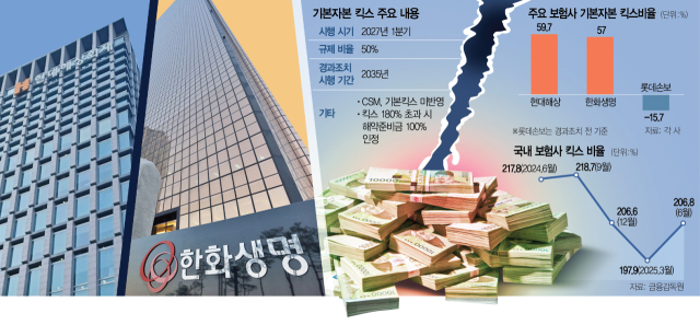 기본자본 킥스 규제가 윤곽을 드러내면서 보험사들의 자본 확충에 비상이 걸렸다는 평가가 나온다.당장 현대해상(59.7%)과 한화생명(57%)처럼 기본자본 킥스 비율이 50%대인 보험사가 문제다.롯데손해보험(-15.7%) 역시 1년 안에 증자에 나서야 할 것으로 예상된다.그동안 보험사들은 후순위채 발행을 통해 킥스 비율을 당국 기준치에 맞춰왔는데 앞으로는 증자나 순이익을 쌓는 쪽으로 기본자본 킥스 비율 규제까지 준수해야 하기 때문이다.보험 업계 고위 관계자는 “보험사 사이에서 유상증자 압박이 커진 것은 사실”이라고 설명했다.