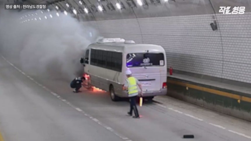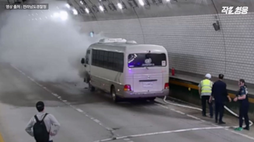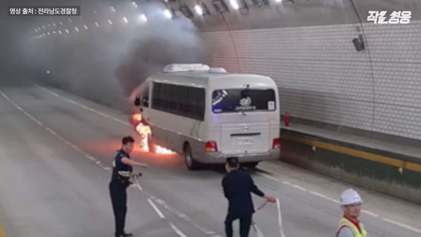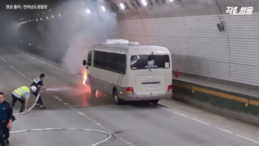 터널 안에 멈춰 선 버스에서 희뿌연 연기가 뿜어져 나오더니 어느새 불길이 솟구칩니다.현장에 출동한 경찰은 소화기를 들고 달려가 진압을 시도하지만 불길은 더욱 거세집니다.