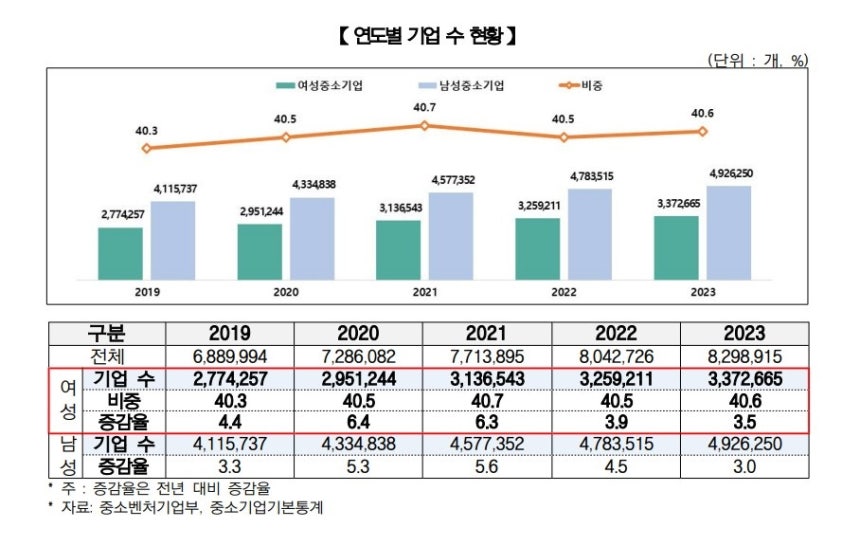 여성 대표가 이끄는 중소기업 수가 많아져 역대 최고치를 기록했다고 합니다.여성기업종합지원센터 부설 여성경제연구소는 '2023년 기준 여성 중소기업 현황'을 18일 발표했는데요.발표에 따르면,여성 중소기업 수가 337만 2665개로 전년 대비 3.5%(2022년 기준,325만 9211개) 증가했습니다.같은 기간 남성 중소기업 증가율은 3.0%였습니다.여성 중소기업 매출도 전년도 대비 13조 2414억 원 증가해 639조 4750억 원으로 조사됐습니다.반면,사설 홀덤남성 중소기업 매출액은 오히려 0.8% 감소한 것으로 집계됐습니다.