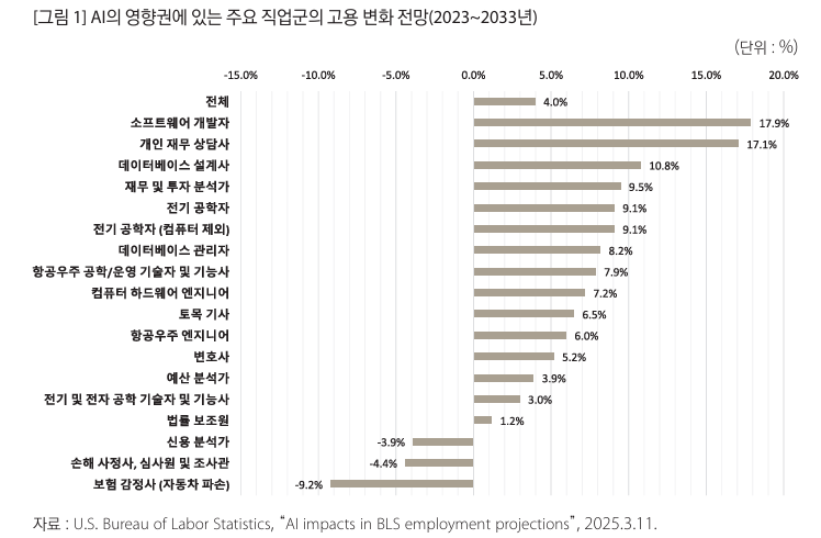올해 3월 미국 노동통계국(BLS)이 발표한 'AI 영향권에 있는 주요 직업군의 고용변화(2023~2033년)'에 따르면 AI 노출도가 높은 주요 직업군이 겪게 될 고용 변화를 보여준다.이 기간 동안 미국 전체 직업군의 평균 고용 증가율은 약 4% 정도로 예상되지만,개별 직군별로 고용 전망은 크게 엇갈린다.