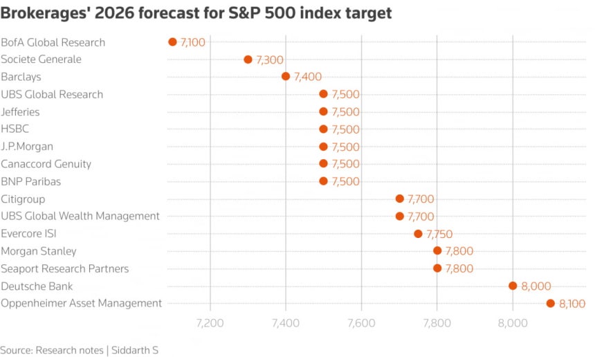 이렇게 단기 전망은 다소 엇갈려도,2026년 미국 증시에 대한 월가의 전망은 낙관론이 압도적입니다.내년에도 4년 연속 상승장이 이어질 것이란 이야기입니다.다만 상승폭에 대해선 하우스별로 전망이 크게 갈립니다.뱅크오브아메리카는 내년말 7100,JP모건 7500,골드만삭스 7600,도이치방크 8000,오펜하이머는 8100을 내다보고 있습니다.