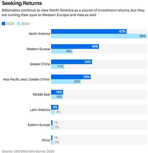 그럼에도 전 세계 부자들의 유럽에 대한 주목도가 높아지고 있는 건 사실입니다.UBS가 억만장자 고객 87명을 설문조사한 결과 향후 12개월 동안 가장 높은 수익률이 기대되는 지역으로 63%가 북미(1위),40%가 서유럽(2위·중복응답 가능)을 꼽았습니다.1년 전엔 북미가 80%로 압도적인 1위,서유럽은 18%로 3위였음을 고려하면 유럽 주식에 대한 관심이 커졌습니다.