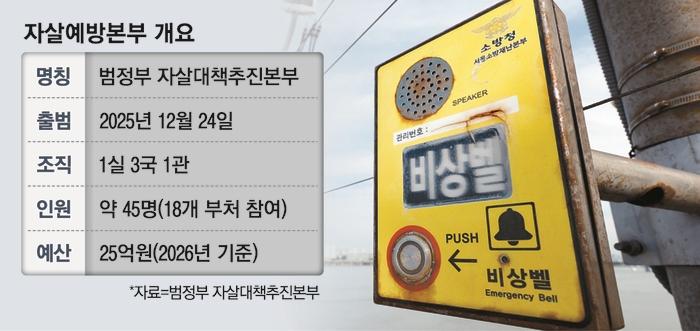 국무조정실은 지난 24일 국무총리 소속‘범정부 자살대책 추진본부’(추진본부)를 출범했다.추진본부는 총 18개 부처에서 정부 인력을 파견받아 45명가량의 본부를 구성해 운영할 방침이다.내년도 예산은 기획재정부와의 협의를 통해 25억원으로 승인됐다.
