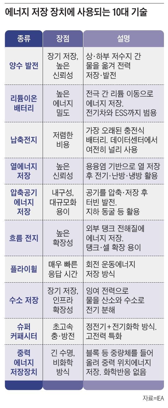 전력망 안정성과 재생에너지 확대의 핵심인 에너지 저장 기술은 다양한 방식으로 진화하고 있다.국제에너지기구(IEA)는 2025년 배터리 저장을 가장 빠르게 성장한 에너지 기술로 평가했다.양수 발전과 리튬이온 배터리,납축전지,열에너지 저장 등 다양한 기술이 각각의 수요에 맞춰 활용되고 있다.아울러 중력 에너지 저장 기술과 플라이휠·수소 등 차세대 솔루션도 떠오르고 있다.